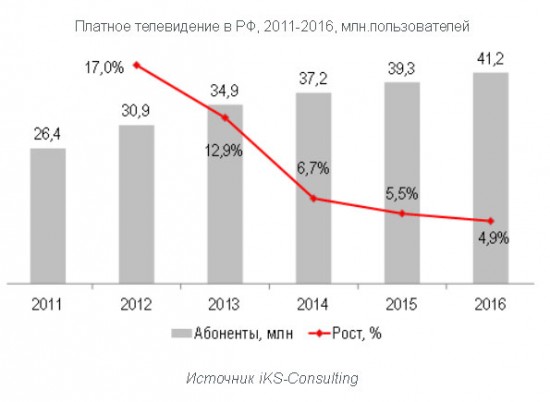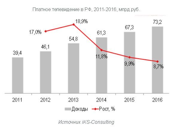 Аналитики iKS-Consulting выяснили, что на протяжении 2016 года к платному телевидению подключилось еще 2,9% пользователей. Общая абонентская база операторов увеличилась до 41,2 млн. Стоит признать, что в 2015 году темпы роста базы пользователей были немного выше. Они достигли 5,5%. Но говорить о перенасыщении рынка платного телевидения еще слишком рано. Операторы получили прибыль, равную 73,3 млрд рублей. Их доход увеличился более чем на 8%, хотя в 2015 году этот показатель достигал почти 10%.