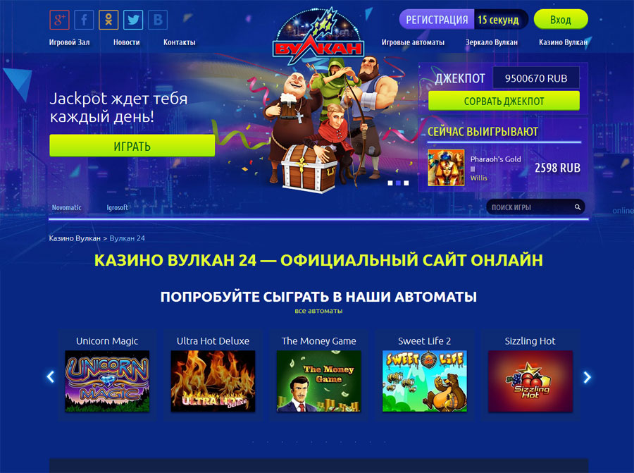 В клубе Вулкан 24 можно полезно и весело проводить досуг. Платные версии улучшат материальное положение, но играть без риска всегда можно с демо-слотами. Денежная игра начинается после авторизации, для этого заполните простую форму или используйте страницу из социальных сетей.